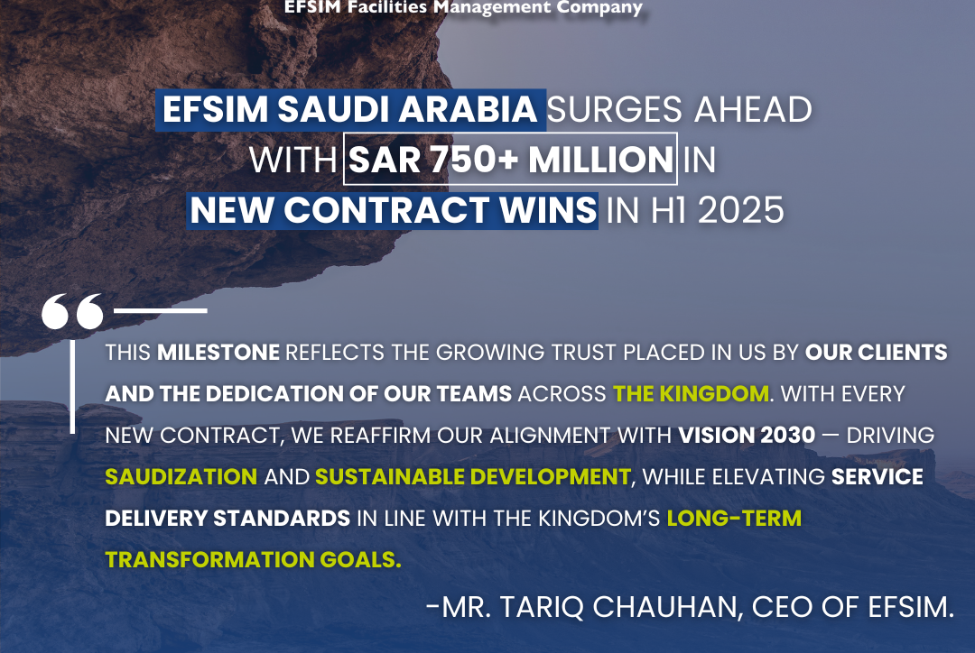 شركة “إي أف إس آي إم” تفوز بعدد من العقود الاستراتيجية بقيمة تتجاوز 750 مليون ريال خلال النصف الأول من عام 2025م يسهم الفوز بهذه العقود في ترسيخ ريادة الشركة ضمن قطاع إدارة المرافق في المملكة العربية السعودية تواصل الشركة توسيع أعمالها في القطاعات سريعة النمو مثل الضيافة والترفيه والرياضة، إلى جانب تعزيز حضورها في المنطقة الجنوبية للمملكة عيّنت الشركة أكثر من 800 موظف خلال النصف الأول من عام 2025بهدف دعم جهود تنفيذ المشاريع الرئيسية، ليصل عدد منسوبيها إلى أكثر من 8500 موظف الرياض، المملكة العربية السعودية، 25 أغسطس 2025م: كشفت شركة “إي أف إس آي إم” لإدارة المرافق (EFSIM)، المزود الرائد لحلول إدارة المرافق المتكاملة في المملكة العربية السعودية، عن فوزها بعقود جديدة تتجاوز قيمتها 750 مليون ريال خلال النصف الأول من عام 2025م، في إنجاز بارز يؤكد على دورها المحوري كشريك مفضل للعملاء في القطاعين العام والخاص حول المملكة. وتغطي هذه العقود الجديدة مجموعة واسعة من القطاعات الحيوية مثل البنية التحتية والرعاية الصحية والتعليم والخدمات الحكومية، كما تنطوي على عدد من فرص التوسّع الاستراتيجي في قطاعات الضيافة والترفيه والرياضة، بما يتماشى مع مستهدفات التحول الوطني تحت مظلة رؤية السعودية 2030. ويبلغ متوسط مدة هذه العقود 3 سنوات، مما يعكس قدرة الشركة على تحقيق قيمة مستدامة على المدى الطويل من خلال المرونة التشغيلية والابتكار والتميز في تقديم الخدمات. وبالإضافة إلى ذلك، نجحت “إي أف إس آي إم” في توسيع رقعة عملياتها لتشمل المنطقة الجنوبية في المملكة، في خطوة مهمة تُسهم في تعزيز حضورها على المستوى الوطني. ولمواكبة هذا النمو، عيّنت الشركة أكثر من 800 موظف خلال النصف الأول من عام 2025م، ليصل عدد منسوبيها إلى أكثر من 8500 موظف. وباشرت الشركة تنفيذ هذه الخطوات ضمن عدد من أبرز مشاريعها الرئيسية، بما في ذلك مشاريع الترفيه والتعليم، مما يعكس نموذج أعمالها المتكامل والمرن في مجال إدارة المرافق وقدرتها على مواكبة التطورات المستقبلية. وبهذه المناسبة، قال طارق شوهان، الرئيس التنفيذي لشركة “إي أف إس آي إم” لإدارة المرافق: “يسلّط هذا الإنجاز الضوء على تنامي ثقة العملاء، كما يعكس الجهود الاستثنائية التي تبذلها فرق العمل المنتشرة في جميع أنحاء المملكة. ومع كل خطوة جديدة، تؤكد الشركة على التزامها بالمساهمة في تحقيق مستهدفات رؤية 2030 من خلال دعم جهود التوطين والتنمية المستدامة، إلى جانب الارتقاء بمعايير تقديم الخدمات بما يتماشى مع مستهدفات مسيرة التحول الوطني للمملكة.” ويجسّد الفوز بالعقود الجديدة ركيزة أساسية تمكّن الشركة من الانتقال نحو المرحلة التالية من مسيرة النمو، مدفوعةً بمكانتها الرائدة في القطاع، وجاهزيتها من الناحية التنظيمية، وقدرتها على إحداث تأثير واسع النطاق في مشهد البنية التحتية واقتصاد الخدمات المتنامي في المملكة.